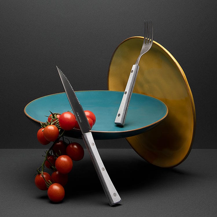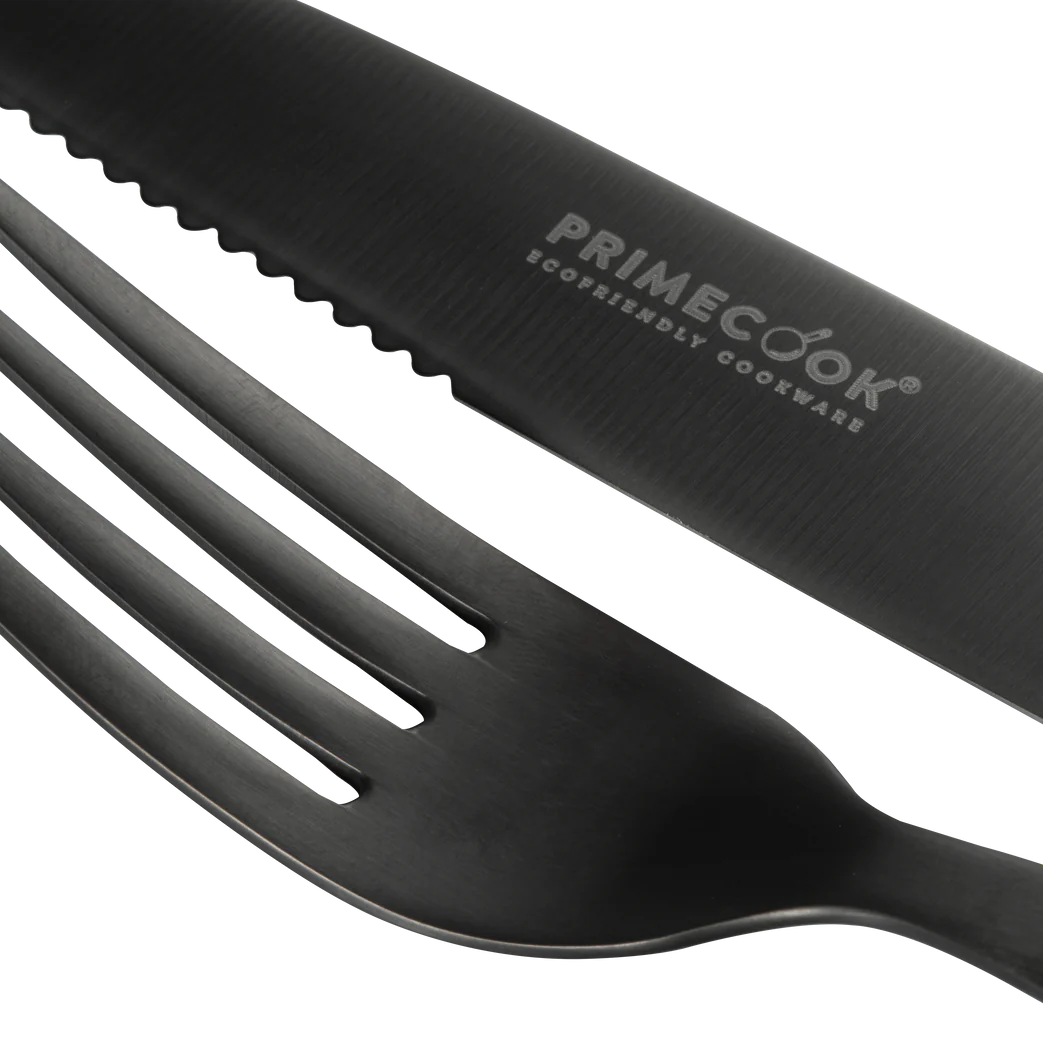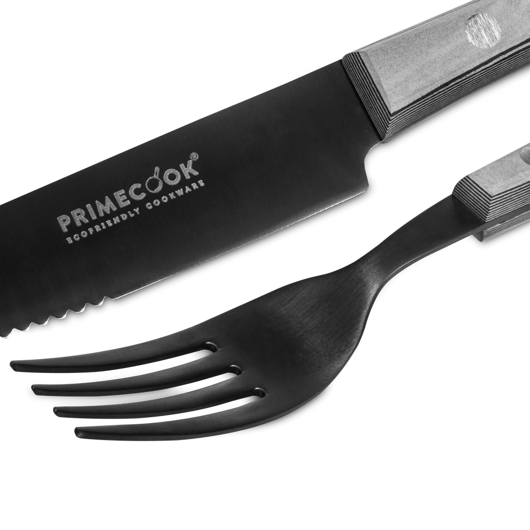 Set van vork en gekarteld mes 13 cm voor professioneel en huishoudelijk gebruik van zeer hoogwaardig roestvrij staal. Het mes is ideaal voor het snijden van brood en voedsel dat een precieze daling van het mes vereist. Voorzien van het innovatieve Paperstone®-handvat, ergonomisch en met een verfijnd ontwerp, gemaakt van een gepatenteerd materiaal bestaande uit natuurlijke harsen, papier en gerecycled karton, veel gebruikt in de ziekenhuissector, in meubels en stoffering dankzij de niet-poreuze formule die de verspreiding van schimmels en bacteriën remt. De TITAN-ECOSHIELD-bladcoating maakt het Primecook-mes tot een echt juweel vanwege de duurzaamheid van de snijkant, oppervlaktehardheid, corrosiebestendigheid, hypoallergeniciteit en snijgemak tijdens gebruik. NSF-gecertificeerd artikel.